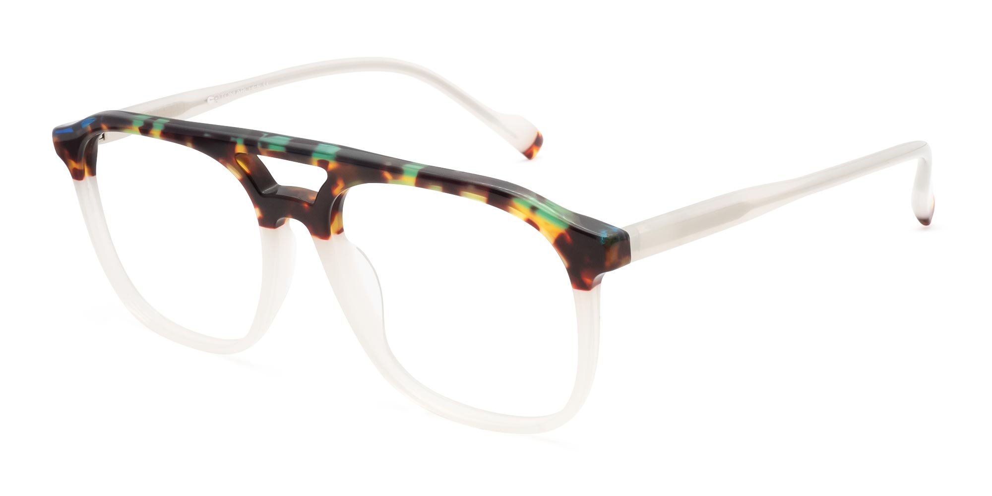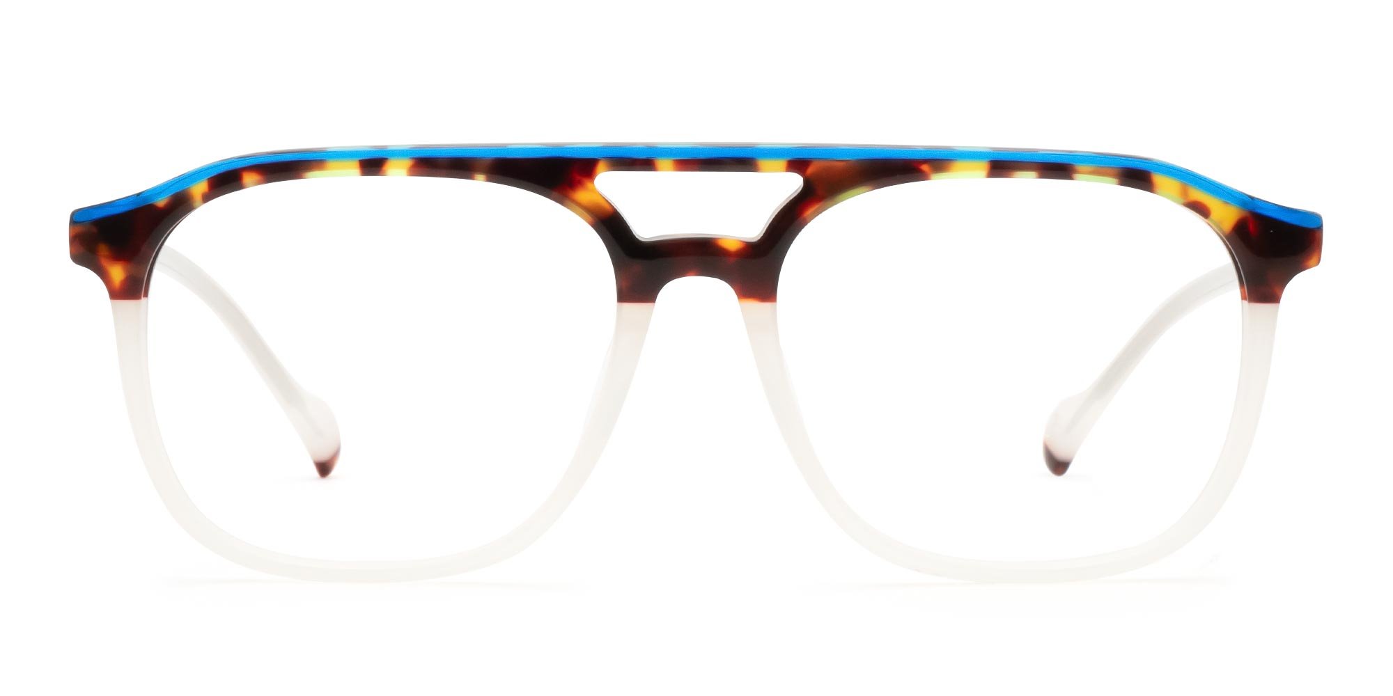 Double bridge glasses have an extra bar running across the top of the frame, above the main bridge. You'll recognise it from pilot-style glasses, though it appears on other frame shapes too.