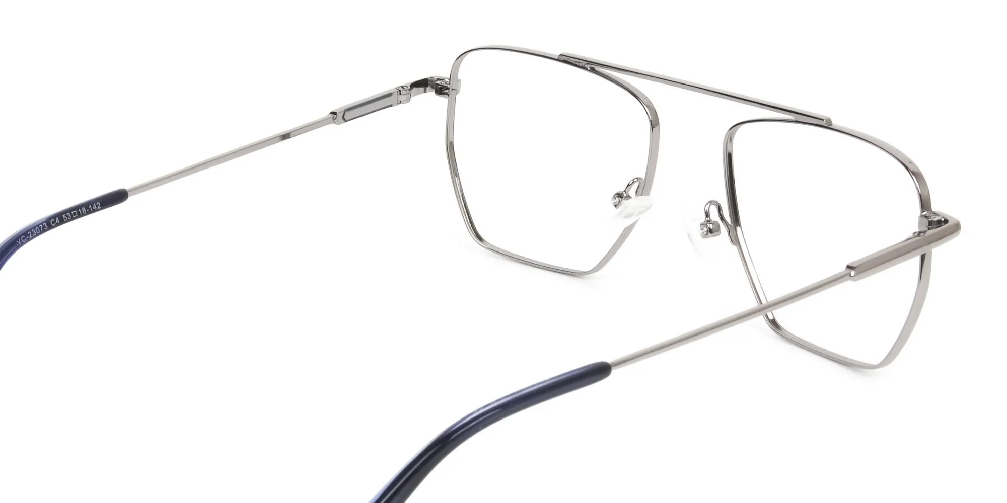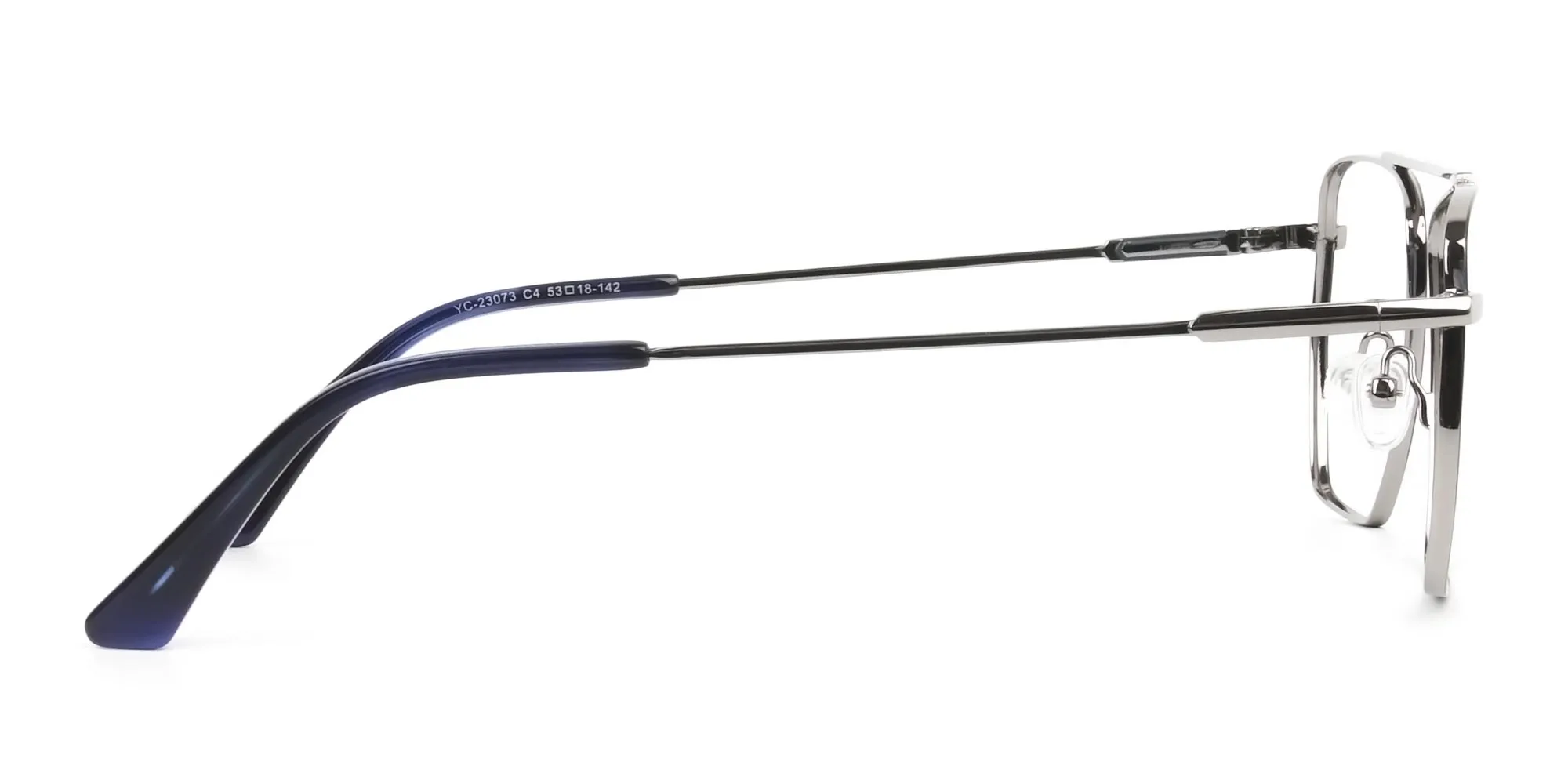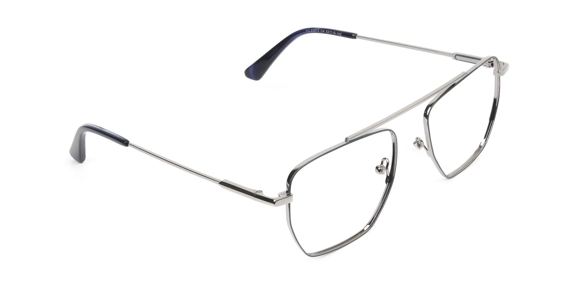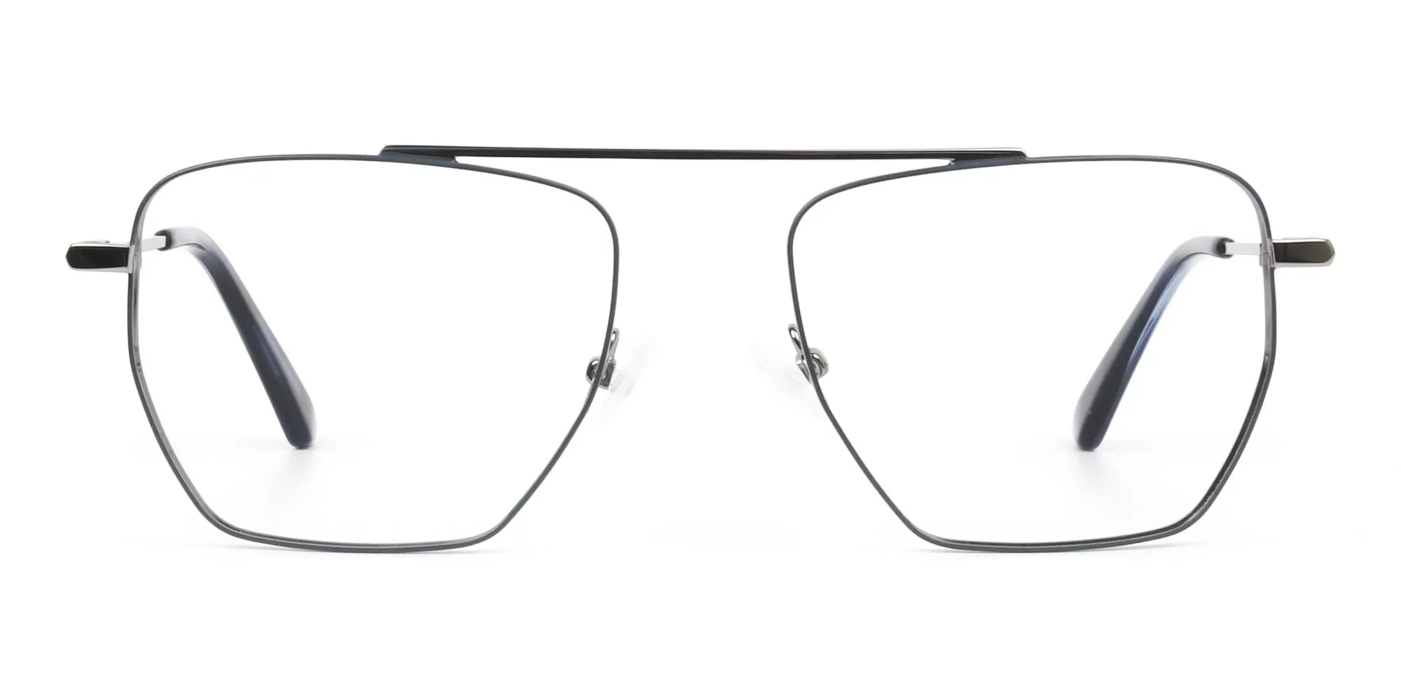 Silver and Royal Blue and Wire Frame Glasses in metal are what you need if you love eccentricity. The quirky eyeglass frames sport a style combo. With classic pilots, the designers have blended the new-age geometric angles that can’t help but be admired. What else makes them stick out a mile? It’s colours. The frame front has silver and royal blue brings forth calmness and subtlety. And the silver temples with perky temple tips help you admire their modishness. These colours are functional enough to go well with any attire whether you are out for a meeting, party or a walk at the beach. The best part is, the glasses don’t differentiate between genders. Plus, they suit about any face shape like square, heart, or oval owing to the eccentric style. Made in metal, you can stay assured of the durable quality of the modern eye frames. Each of their parts adds to this virtue while the comfy nose pads and bridgeless design ensure comfort. Thus, ensuring that style, quality, and care go hand in hand. Don’t wait any more! Get them as prescription or reading glasses today to cherish the shower of compliments they bring along. Let the silver and blue wireframe glasses make you the king or queen of the room.